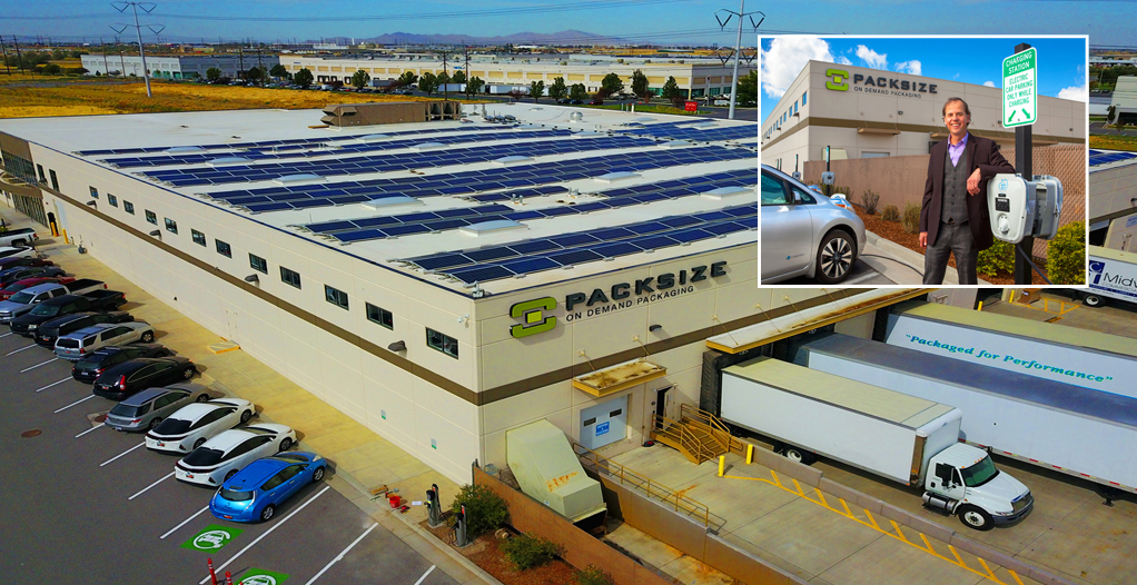 Hanko Keissner at Packsize Packaging has a fleet of 50 electric company vehicles, mostly used by salespeople. He has 53 charging stations in front of his packaging plant in Salt Lake City, and a 200,000-watt solar PV system on the roof. He says the benefits are numerous, starting with fuel savings. If a fleet vehicle travels 200,000+ miles, fuel cost savings are between $50,000 and $60,000 for a total of $2 million – $3 million. Maintenance savings are about 50%, or several thousand dollars more per vehicle. Non-sales employees have begun buying electric cars and charging them while at work in the plant and office. They save about $1000 per year by charging for free at work, but Hanko estimates that because of the solar panels it only costs the company about $100. These initiatives align with the brand. Packsize develops environment-friendly packaging. They also increase employee pride, and make retention and recruitment easier.