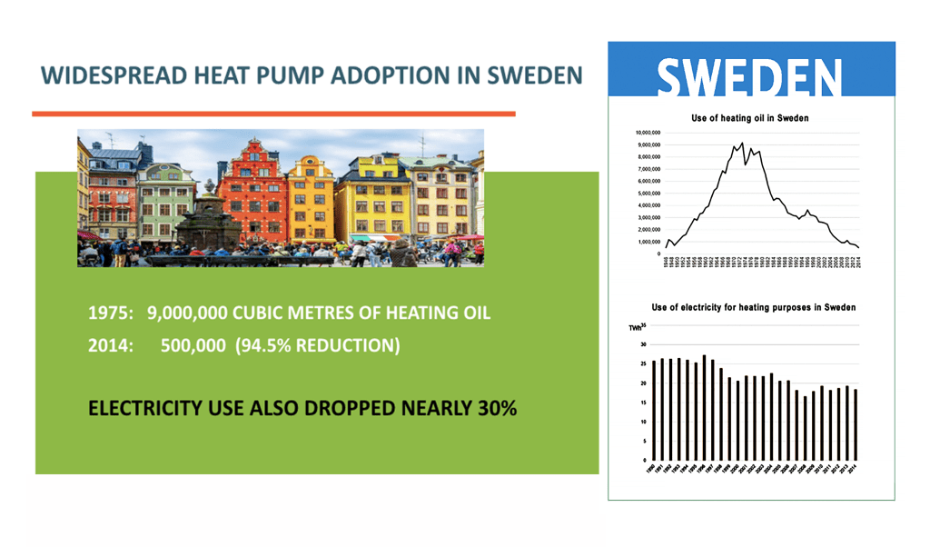 This truth had already been proven. In 1975 Sweden was using more than 9 million cubic metres of heating oil. By adopting heat pumps it reduced this by about 94% by 2014. Electricity use did not increase. It decreased nearly 30% because heat pumps are about three times more efficient than fossil fuel appliances, with virtually no carbon emissions.