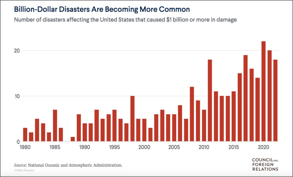 The economy too: The chart below shows just how much extreme weather is increasing along with the cost of damage. According to re-insurance company Swiss Re, in 2022 extreme-weather damages totaled more than $165 billion and the US GDP could drop by between 7% and 14% in the next 25 yearss, depending on what we do about fossil fuels and methane.