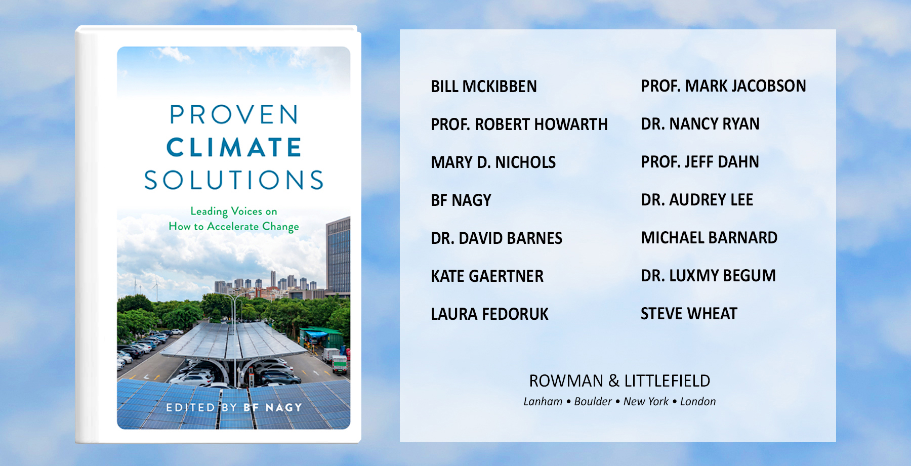 Proven Climate Solutions is a dynamic, evidence-based action plan that brings together world-leading climate scientists and writers like celebrated author and organizer Bill McKibben, Professor Mark Jacobson from Stanford, Dr. Nancy E. Ryan, former Commissioner for the California Public Utilities Commission and electric transportation expert, green buildings and communities specialist BF Nagy and ten other top contributors.
